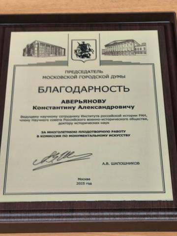 Ведущий научный сотрудник ИРИ РАН, доктор исторических наук К.А. Аверьянов получил благодарность Председателя Московской городской думы А.В. Шапошникова за многолетнюю плодотворную работу в Комиссии по монументальному искусству.